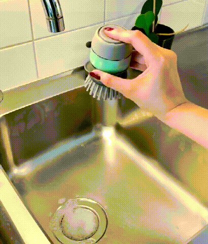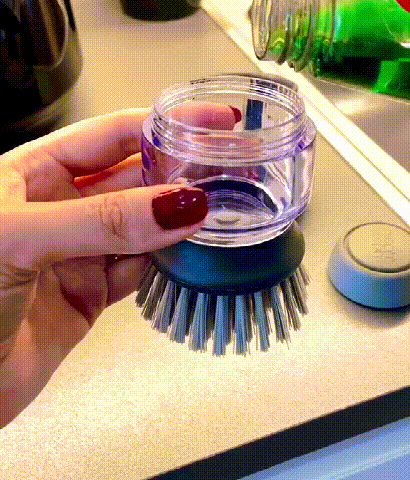EXQUISITE DESIGN: The handle design is easy to grip which fits comfortably in hand even when wet and soapy. The handle can be easily filled with your favorite dish soap liquid. To start cleaning, simply press the button and it will squirt dish soap directly.